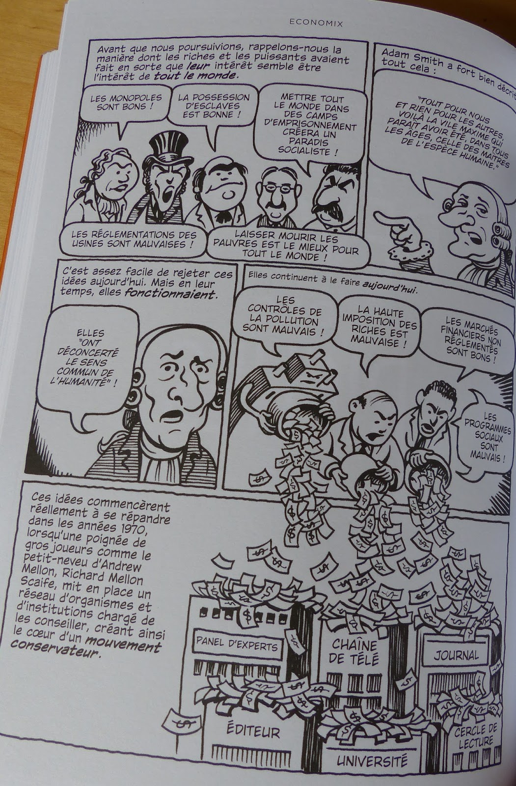 Déjà Economix est une BD. Elle a beau faire 334 pages, c’est moins rebutant qu’un texte du même nombre de pages écrit petit serré avec des graphiques bourrés de statistiques incompréhensibles. Elle explique clairement les mécanismes économiques, ses liens avec le pouvoir, comment elle a évolué historiquement, les grands noms de l’économie et comment tout cela a tendance à être pourri jusqu’à la moelle. Tout cela en huit chapitres et un épilogue.
